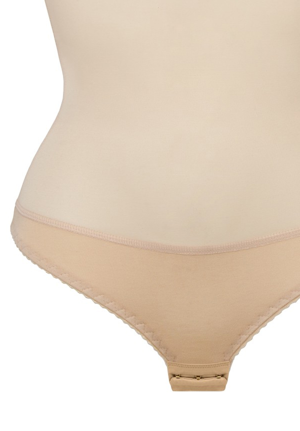 High waist corrective brief. Strong polyamide fabric creates a belt at the front and back that shapes the abdomen and hips. Silicone strip on the top edge prevent it from slipping. Lower part of panties is made of cotton lycra.